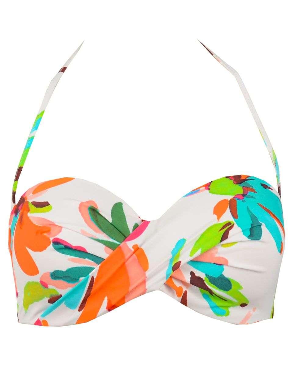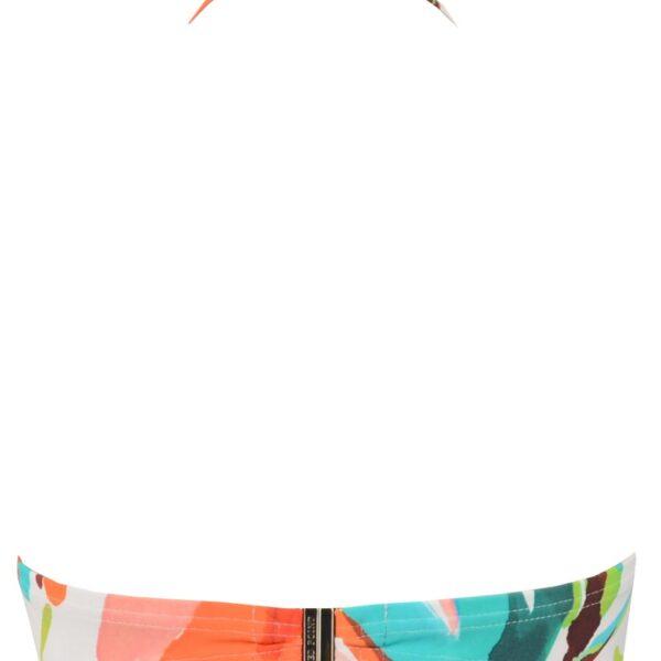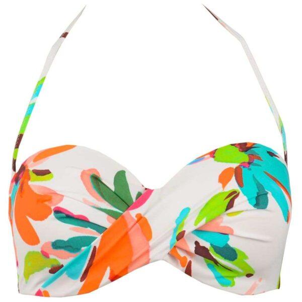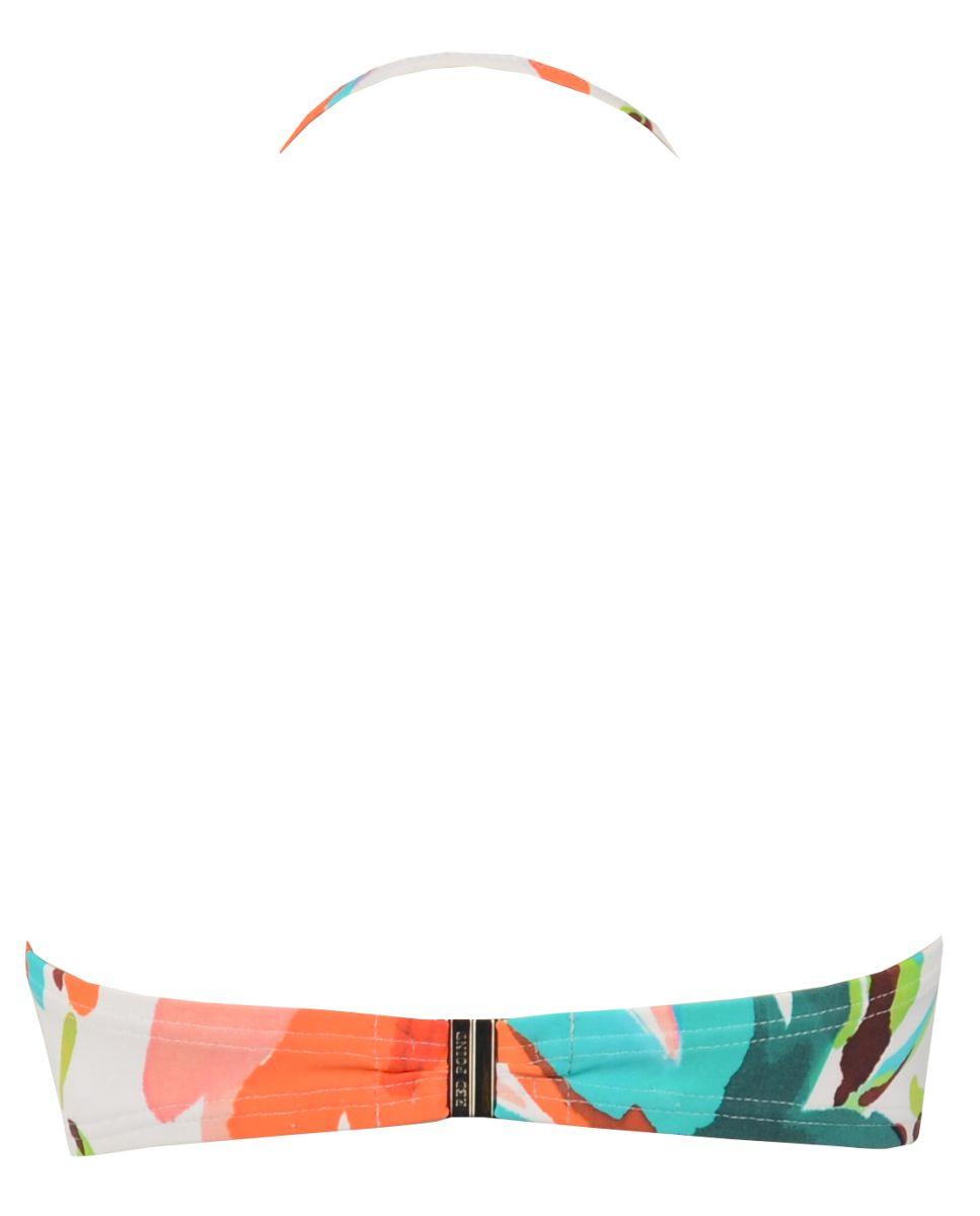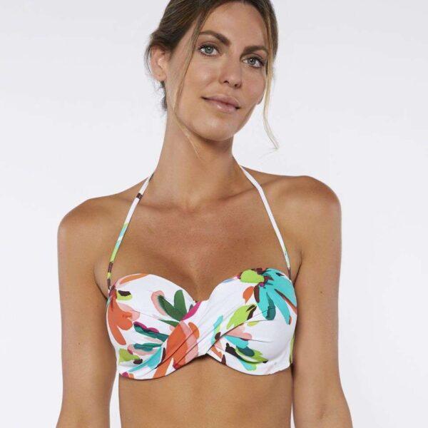 Sostenidor de biquini de dona amb estampat molt colorista de grans flores sobre fons blanc.